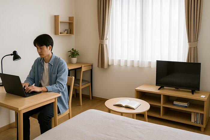 どちらも、ベッドの他、机・テーブル・カラーボックス・テレビなど一般的な家具や電化製品があり、比較的生活しやすい広さになっています。