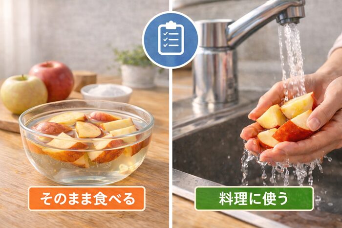 最初に結論からお伝えすると、塩水につけたリンゴは「洗う・洗わない」を目的別に決めればOKです。