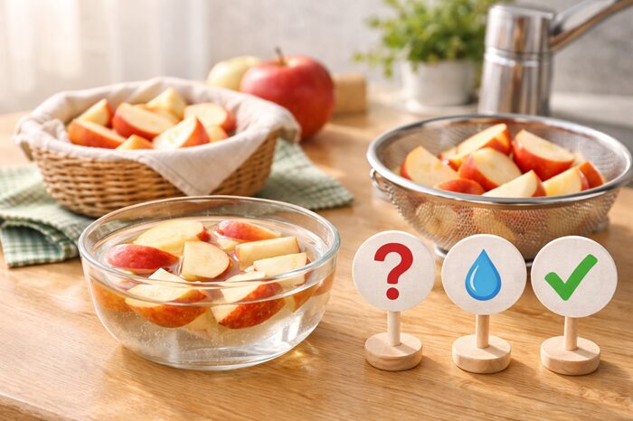 塩水につけたリンゴは、洗う・洗わないで迷いがちですが、大切なのは「どう食べるか」「誰が食べるか」です。