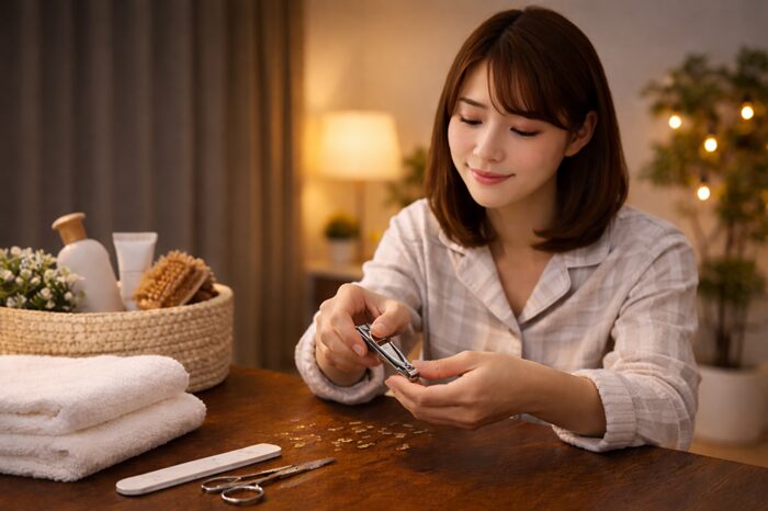 夜に爪を整えるなら、テレビを見ながら何となく切るよりも、お風呂あがりの明るい洗面所などで短時間で済ませるほうが、失敗しにくくなります。